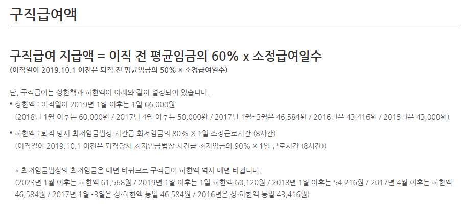 - 하한액: 실직 당시 최저 시급의 80%에 8시간 고정 근무일을 곱한 금액으로 최저 금액이 결정됩니다.