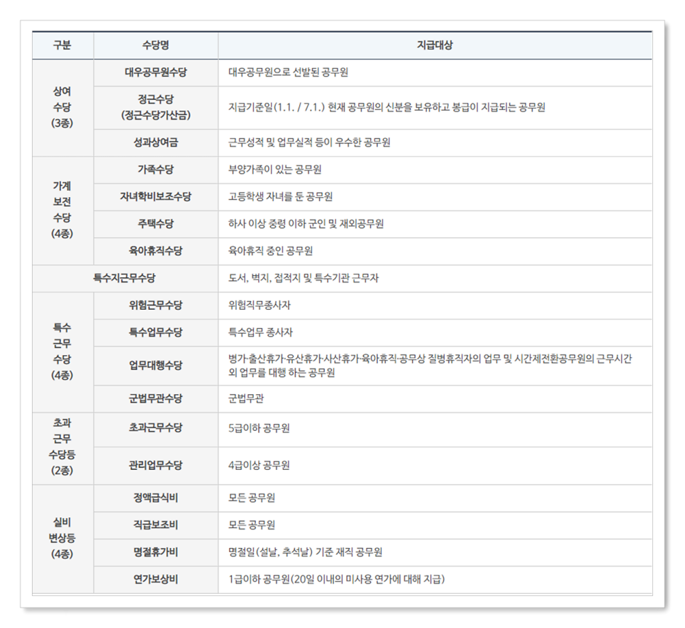 2023 공무원 봉급표와 함께 지급되는 여러 수당들을 살펴보면 가계보전수당 / 상여수당 / 특수근수당 / 특수지근무수당 / 실비변상등 / 초과근무수당 등이 지급되고 있습니다.